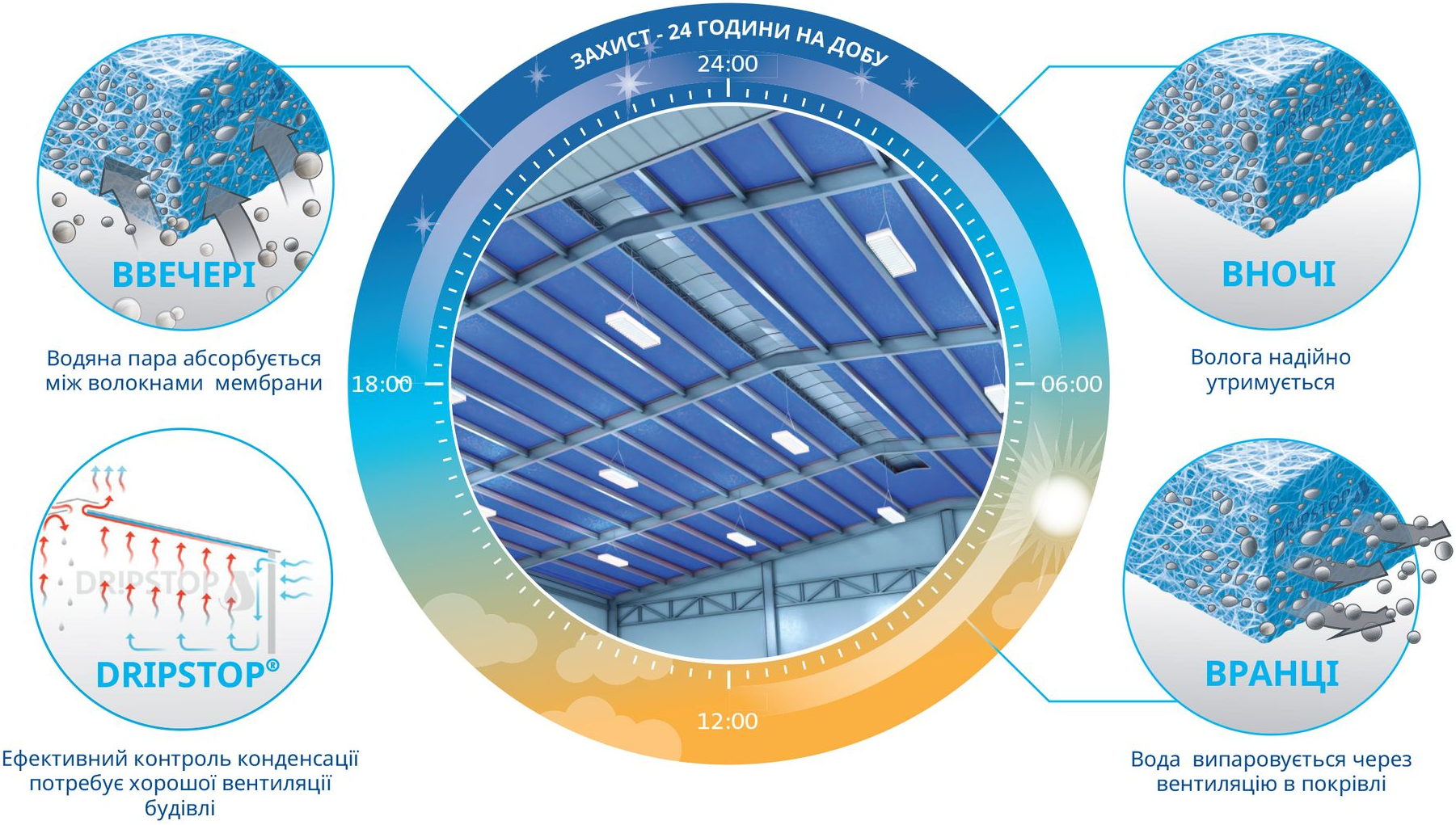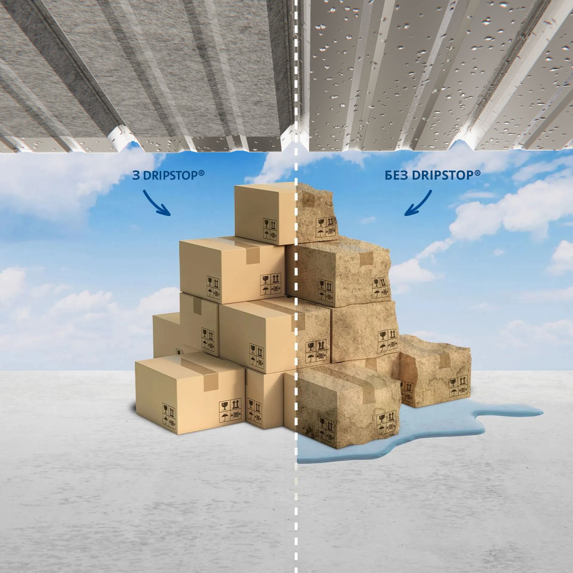 Dripstop® забезпечує відмінний контроль конденсації. Мембрана захищає ваше майно та споруди. Заощаджує кошти на утримання та обслуговування. Наш продукт не потребує додаткового обслуговування, гарантує захист від корозії. Dripstop® запобігає гніздуванню птахів завдяки відсутності додаткової підпокрівельної мембрани. Довіртеся Dripstop® для надійного контролю конденсації з довготривалою якістю та відсутністю турбот.